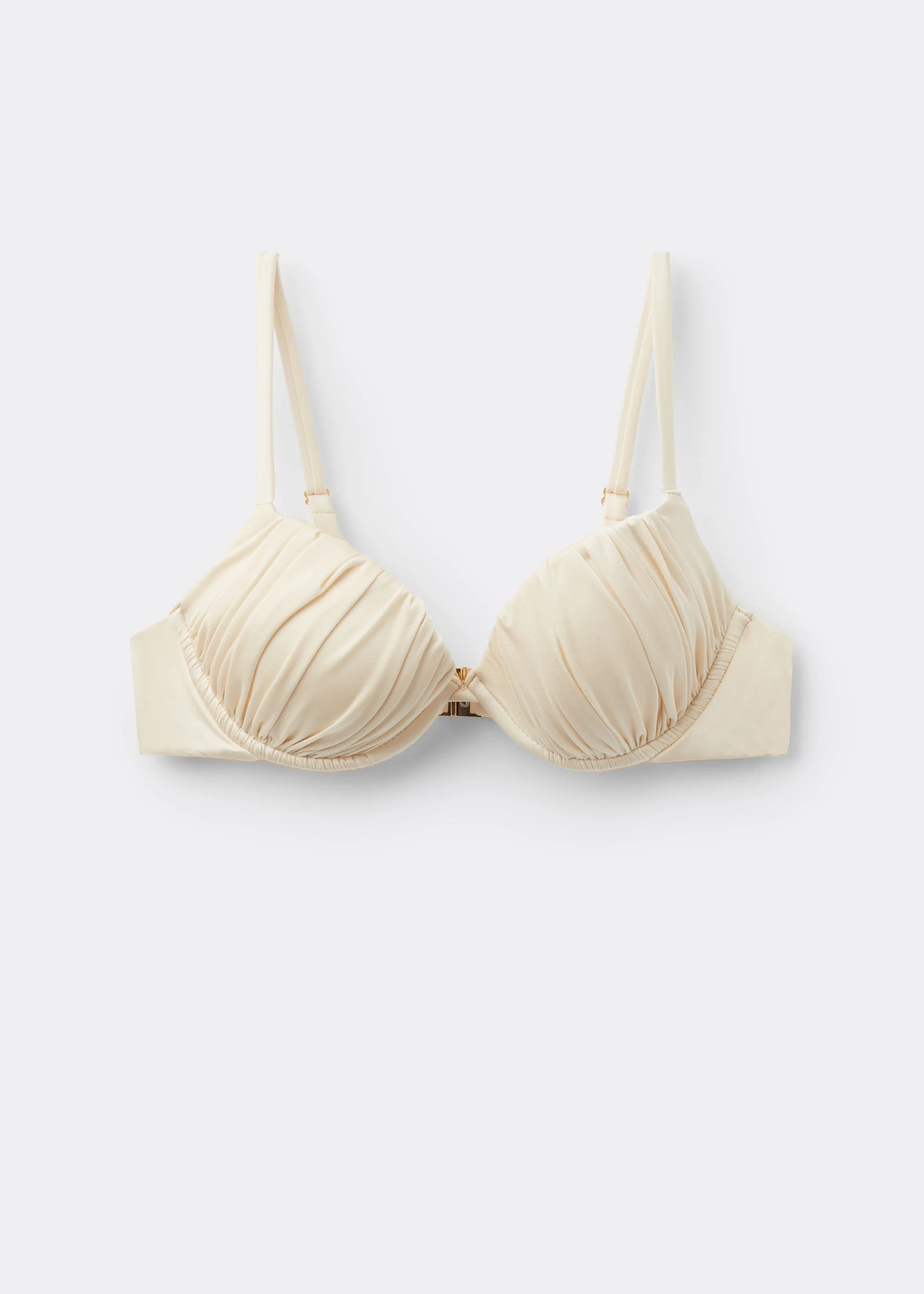 Push-up bikini top with lightly padded cups and underwire to guarantee support and provide volume. The style features a bright fabric with a silky effect. Fixed Shoulder Straps. Rear closure with double adjustment hook.