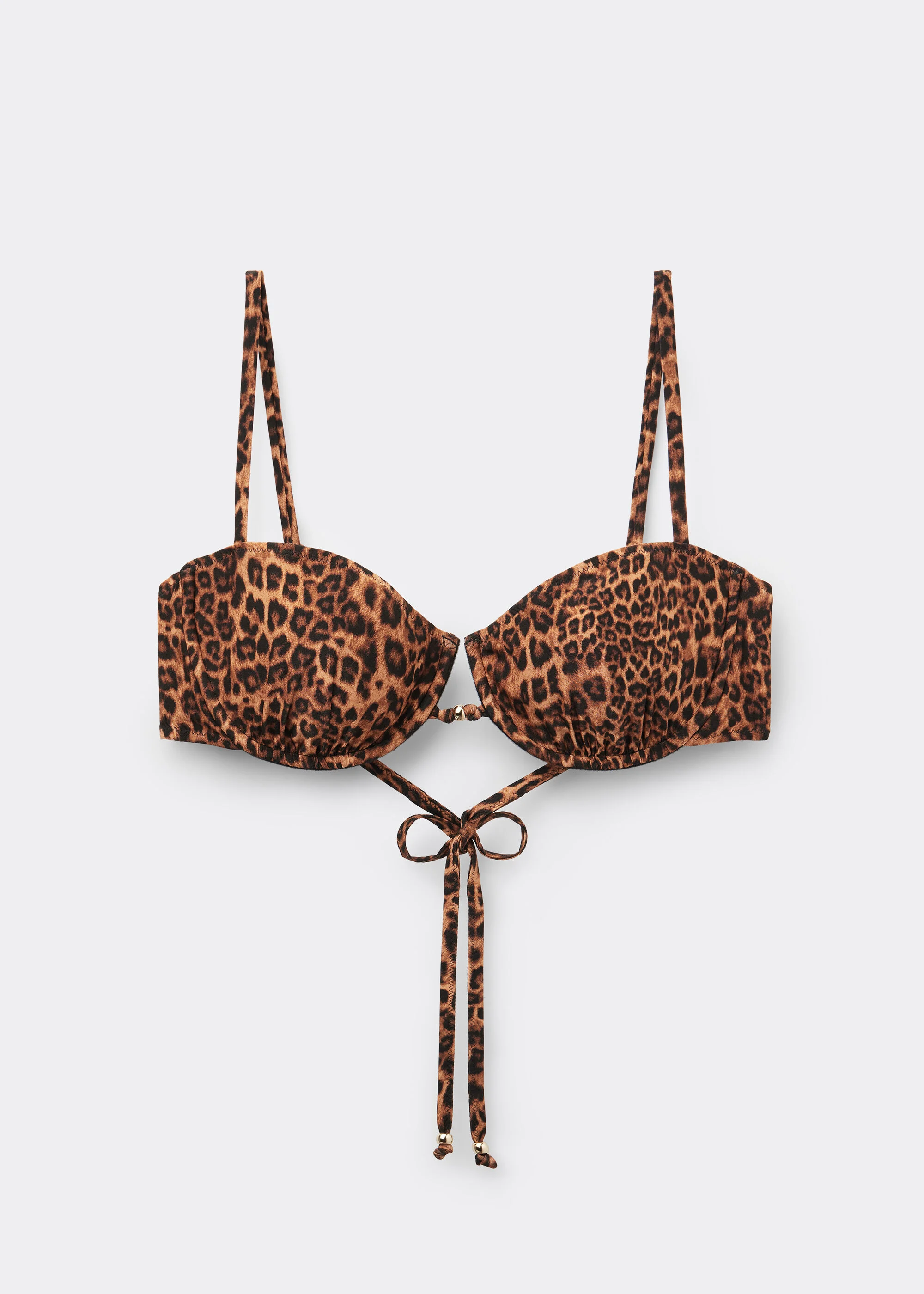 Unpadded balconette bikini top with underwire that guarantees good support even for the most full-sized breasts. Made of soft microfiber with an elegant animal pattern. Adjustable shoulder straps and back string tie closure.